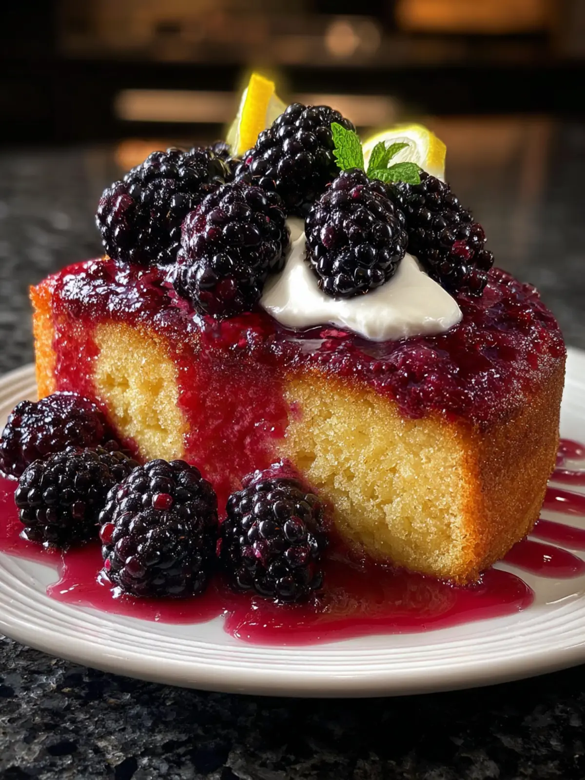- Allow the cake to cool completely. Once cooled, garnish with fresh blackberries and additional lemon zest if desired. Slice and serve on a simple white plate for a beautiful presentation.