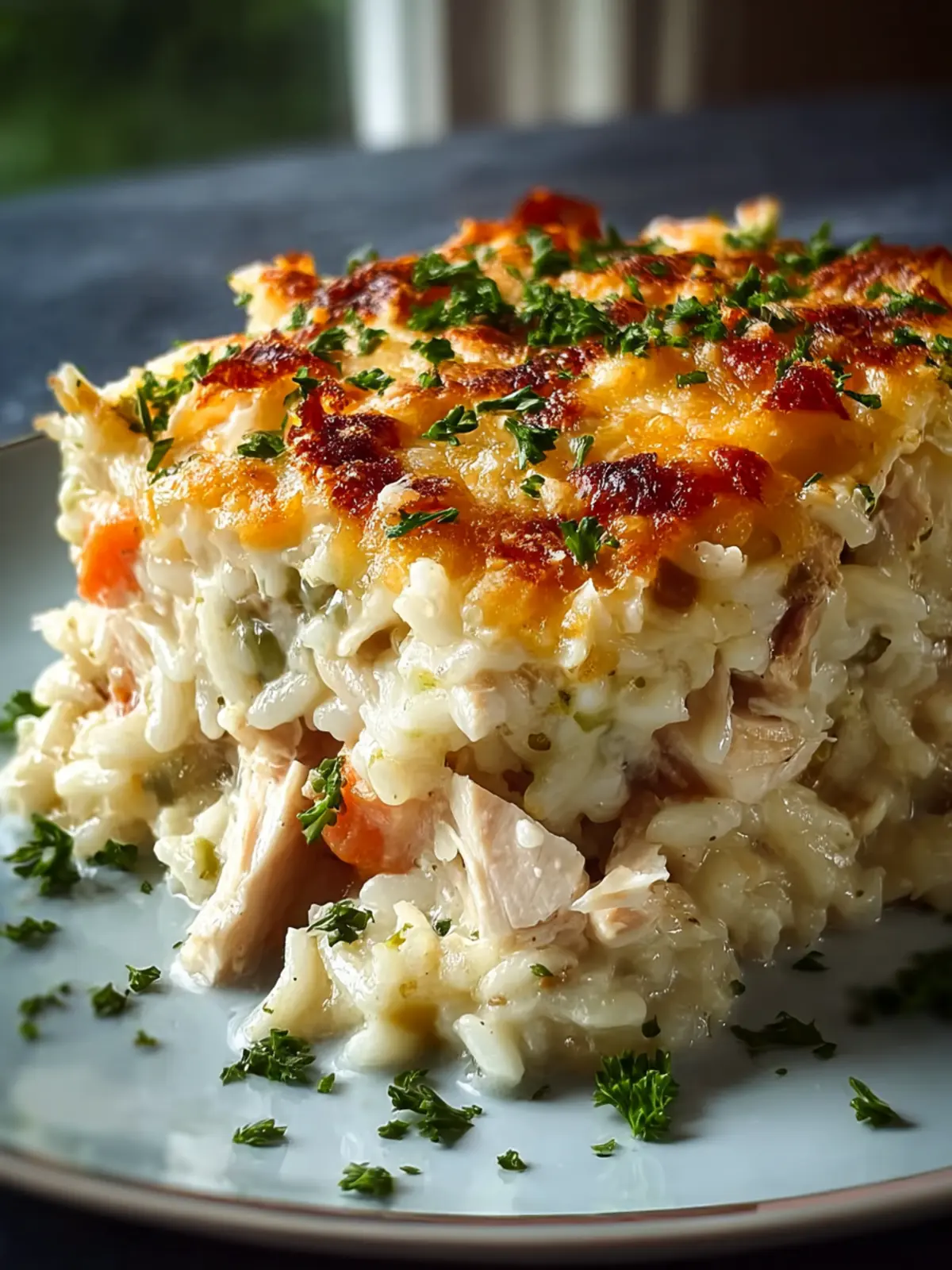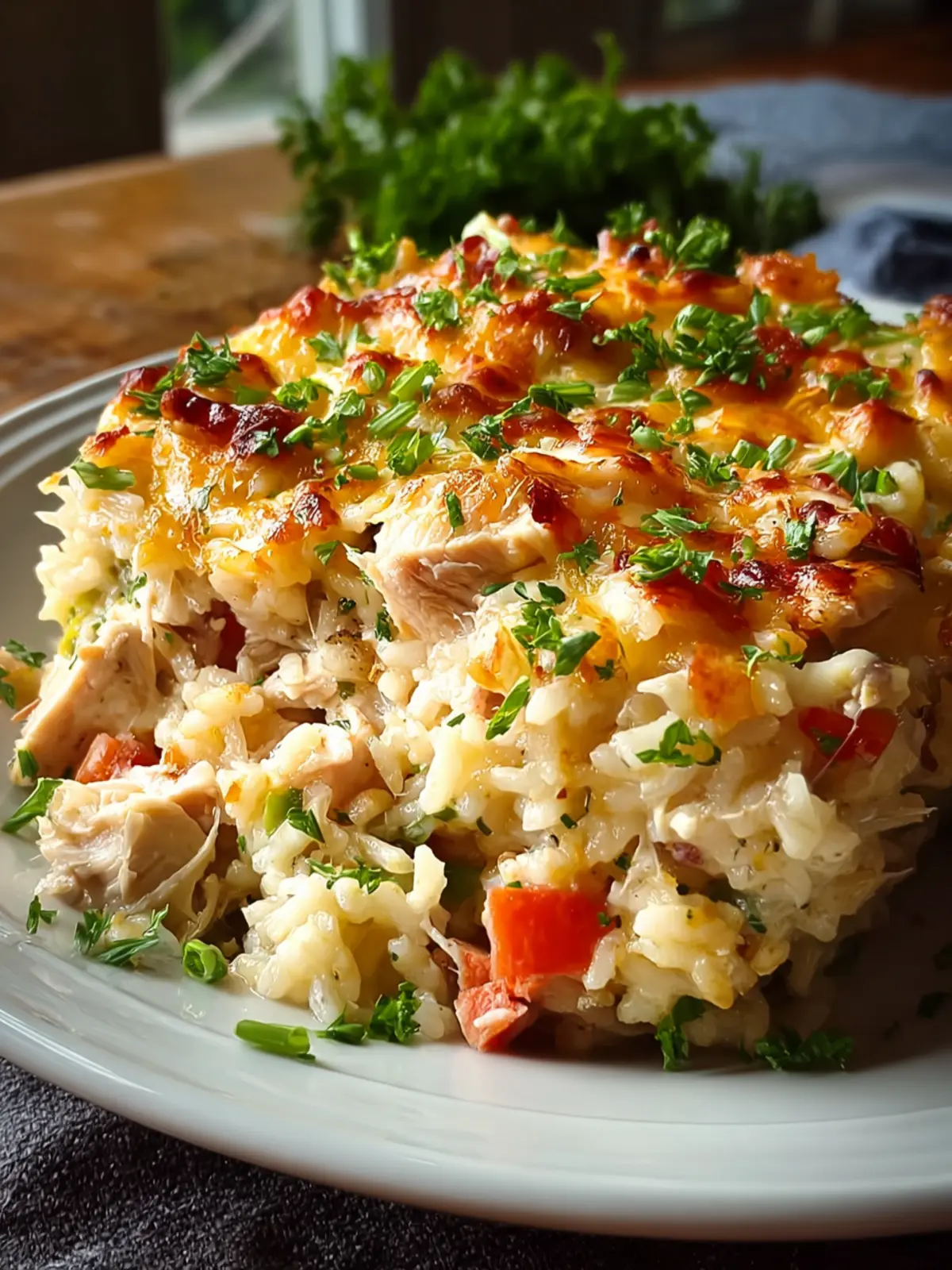 A delicious cheesy casserole with chicken, broccoli, and rice, perfect for a family dinner.