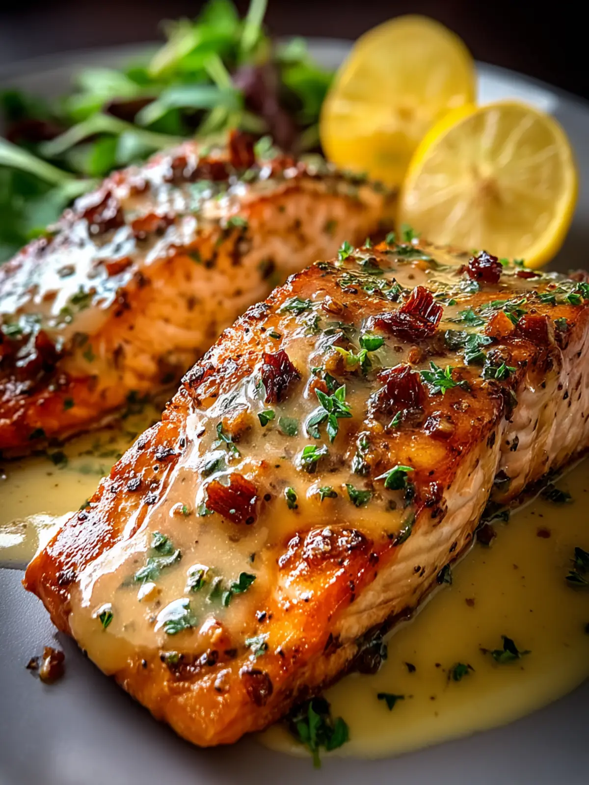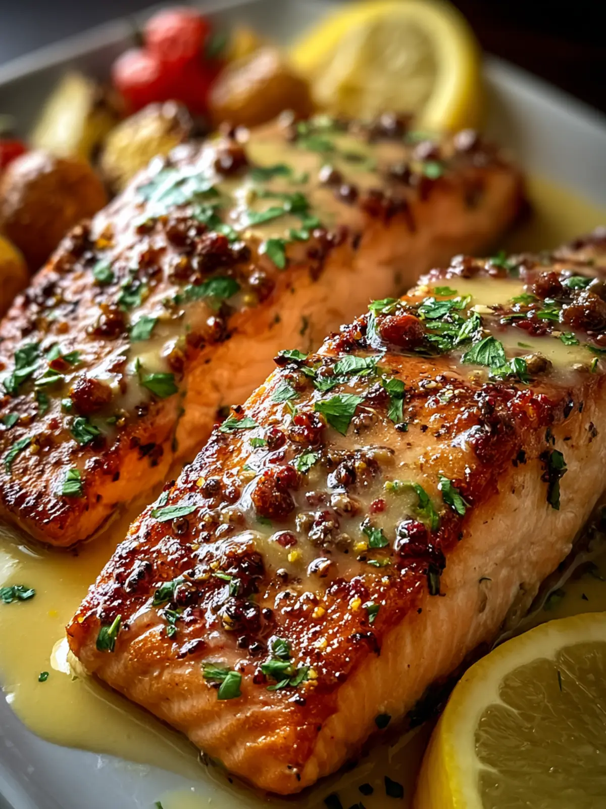 Delicious baked salmon fillets coated with a honey Dijon glaze, garnished with fresh herbs.