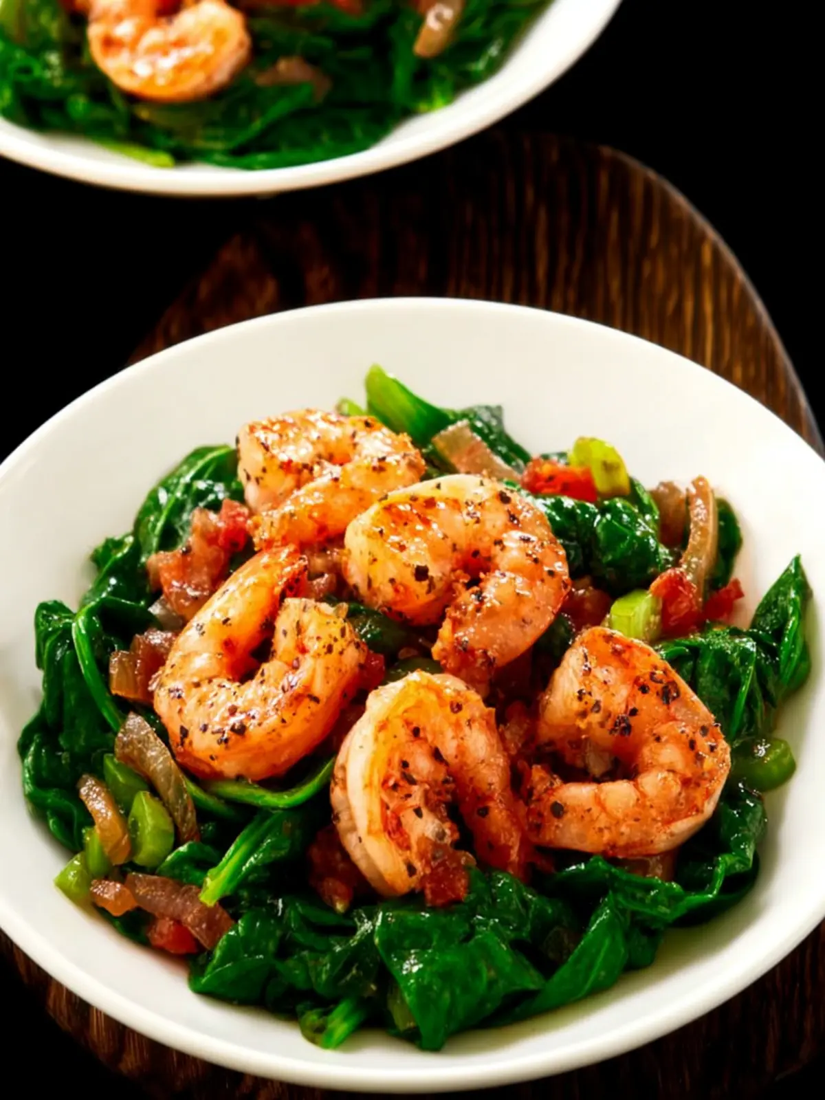 - Divide wilted spinach into bowls and top with shrimp mixture. Serve hot.