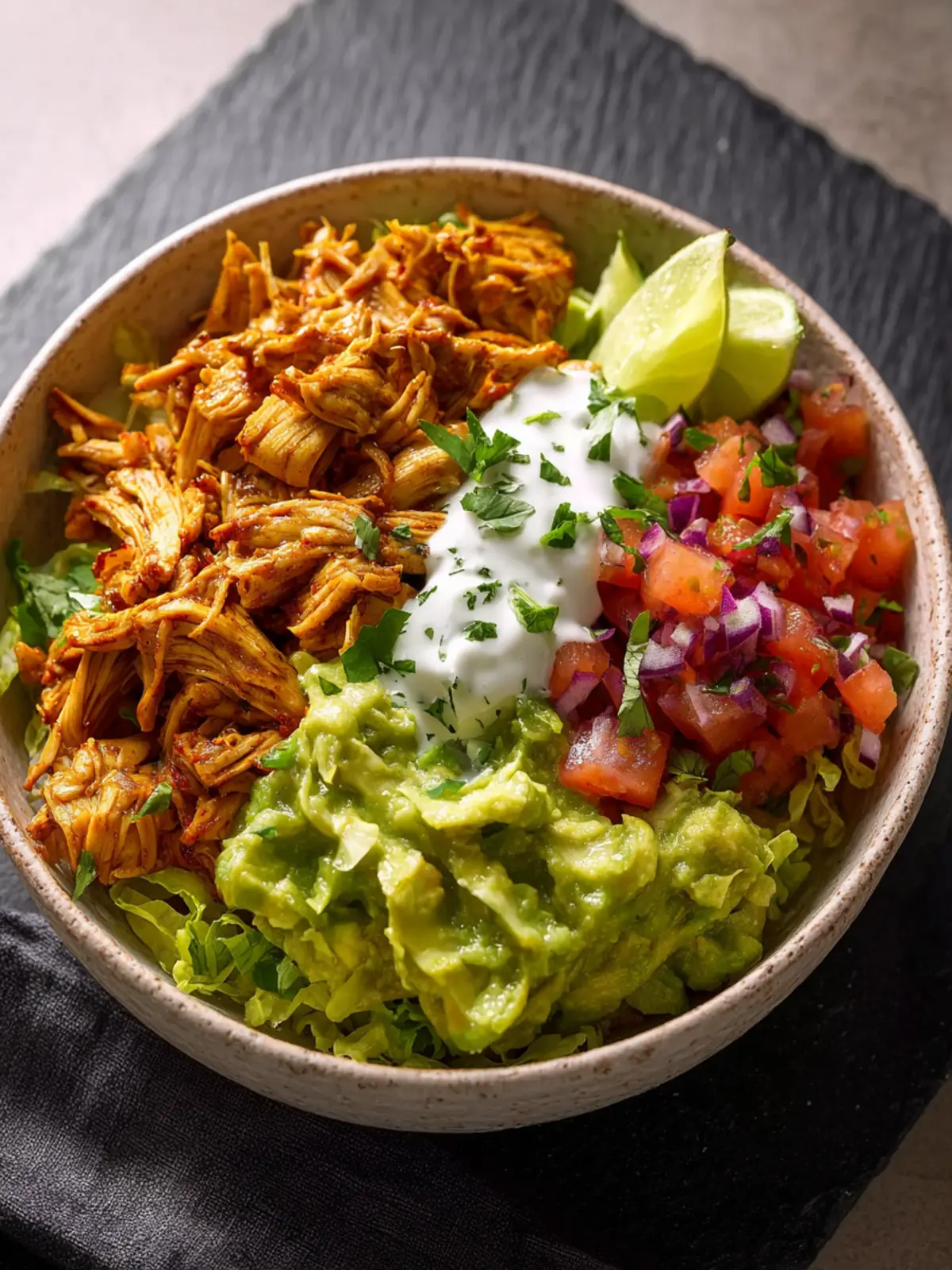 When it’s time to build your bowl, start with a base of brown rice or quinoa for added nutrients. Layer your pulled chicken generously, followed by a dollop of guacamole and any additional toppings like black beans or corn. This layering not only looks stunning but ensures every bite is a symphony of flavors.