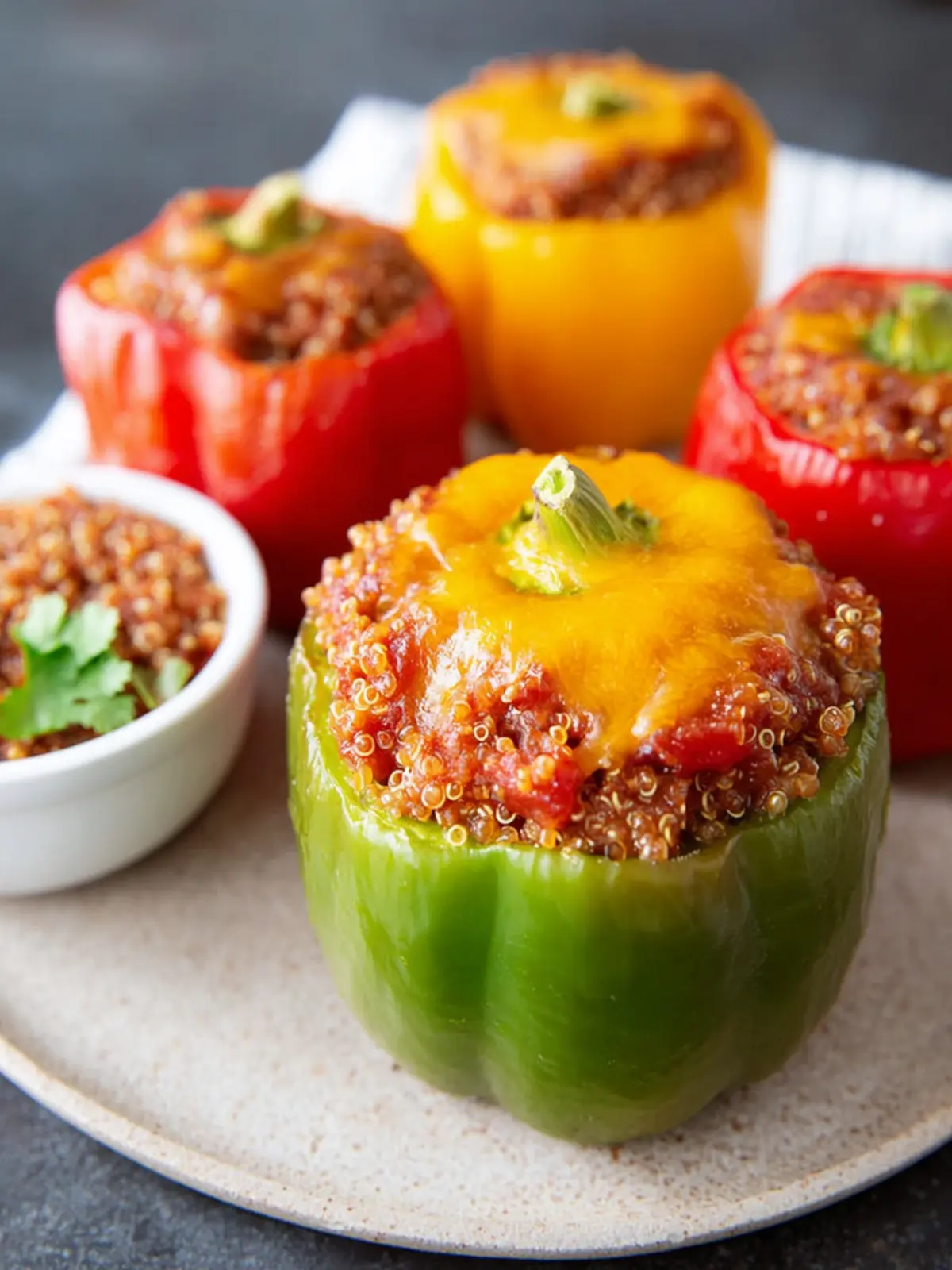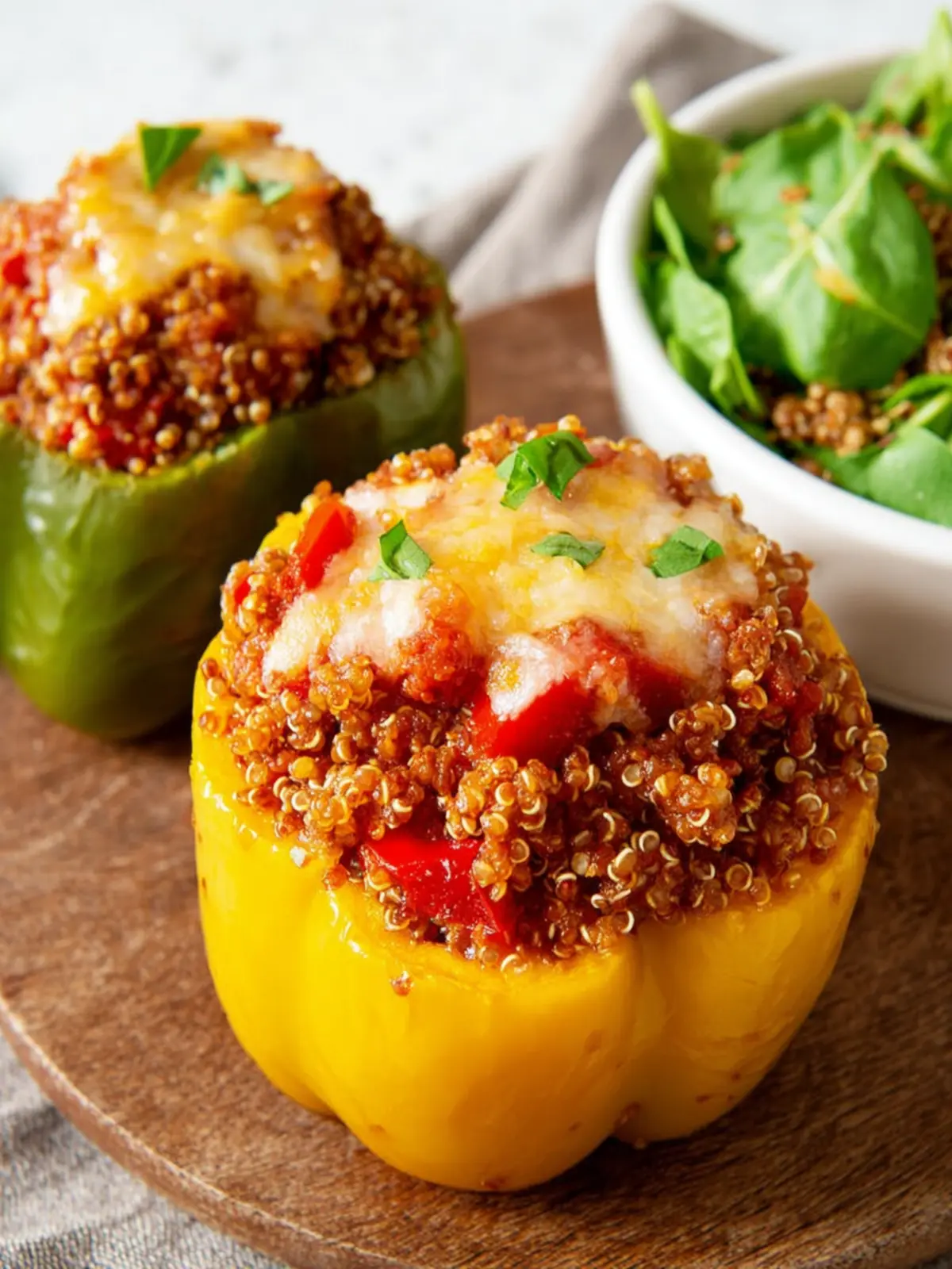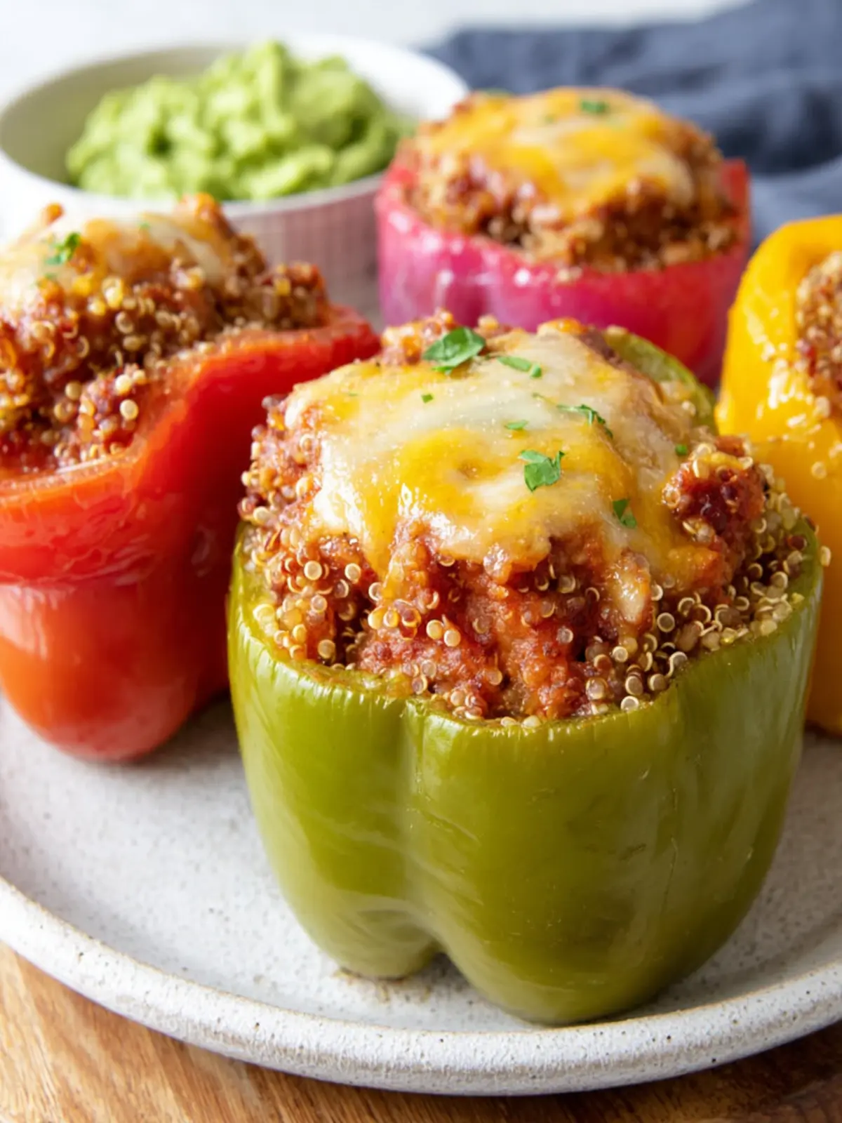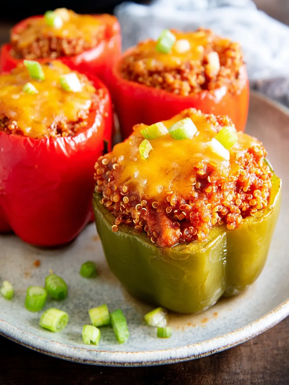 Delicious stuffed bell peppers filled with seasoned ground beef, quinoa, and topped with cheese.