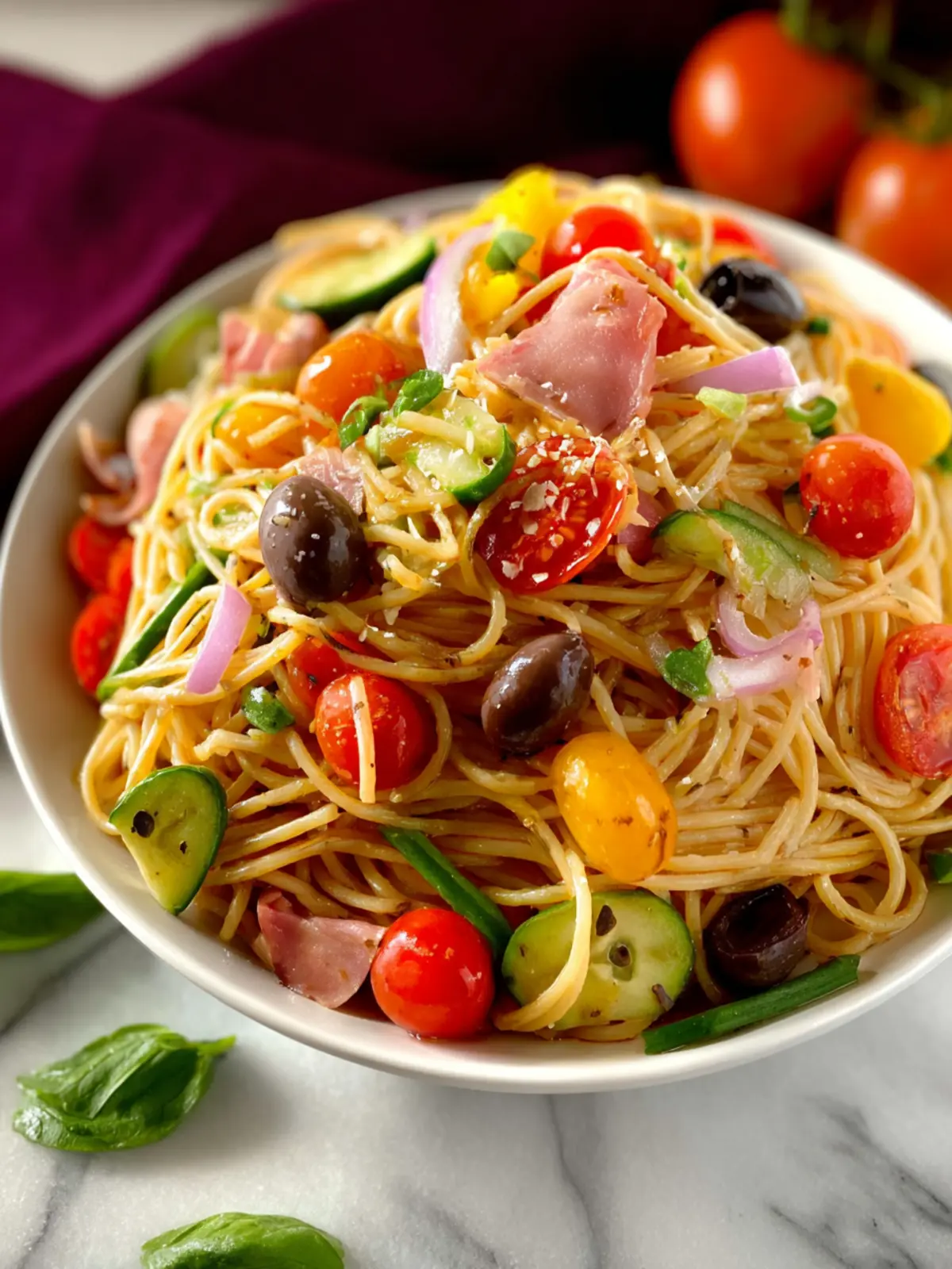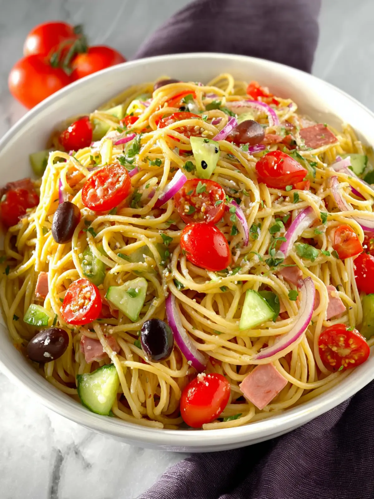 The balance of textures — chewy spaghetti, crisp cucumbers, and juicy tomatoes — makes every bite a delight. Plus, the Italian dressing brings a tangy brightness that elevates simple ingredients into something extraordinary. Packed with vegetables, this salad is also a great way to sneak in some nutrients without compromising on taste.