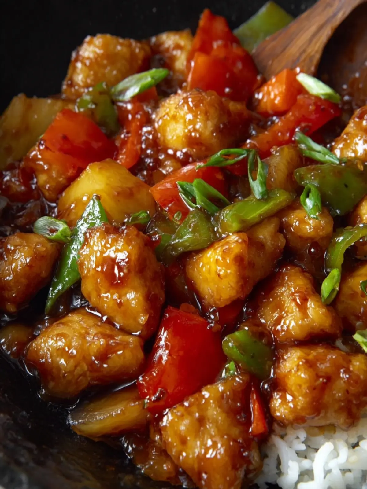 A delicious dish featuring crispy chicken chunks, sweet pineapple, and vibrant peppers in a savory sauce.