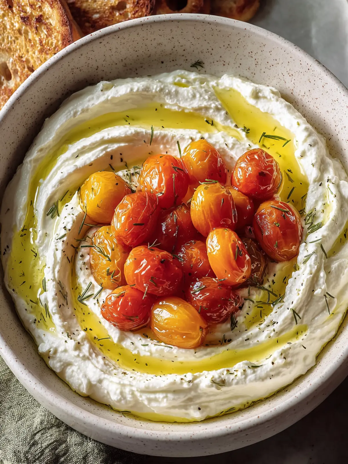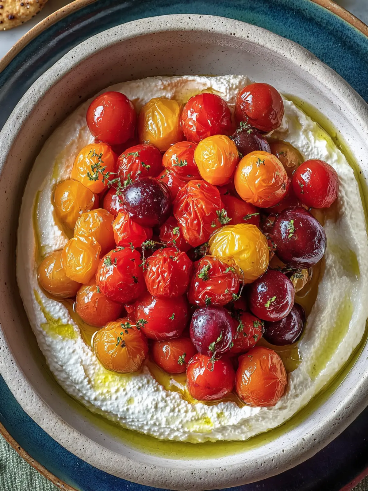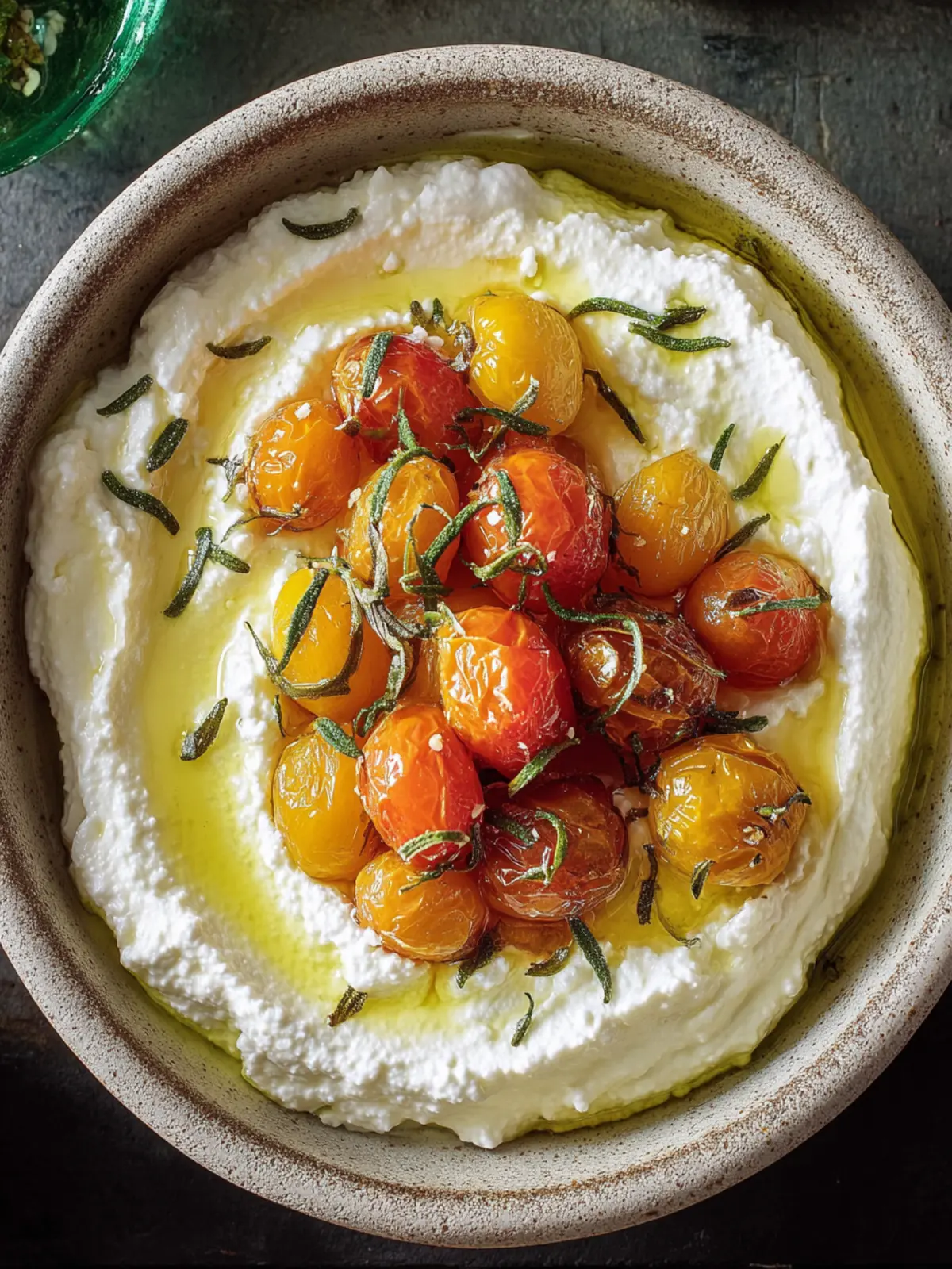 A creamy whipped ricotta dip topped with sweet roasted cherry tomatoes and herbs, perfect for appetizers or snacks.